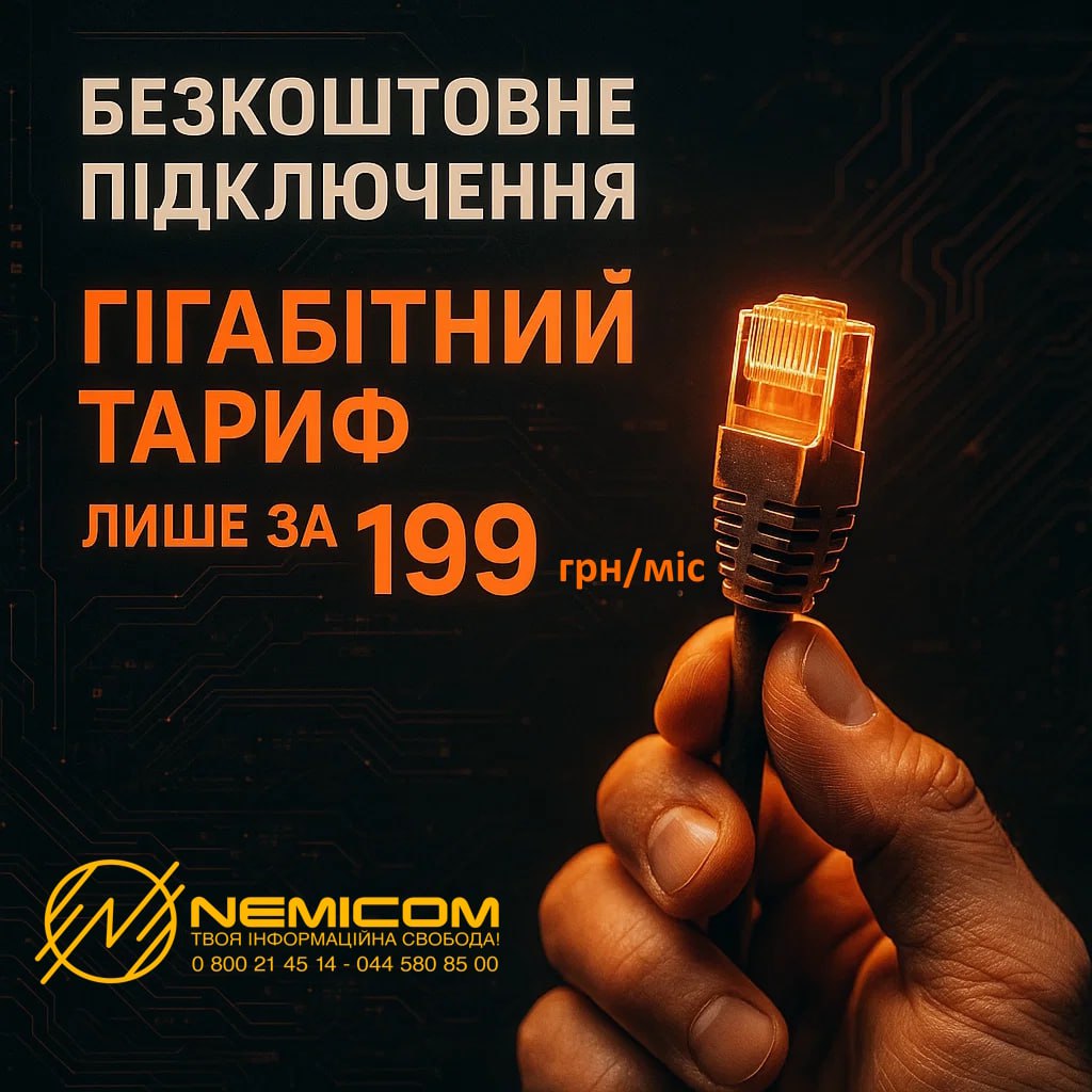 Безкоштовне підключення та тариф 1Гб/с при передплаті на 2 міс.-лише 199 грн/міс